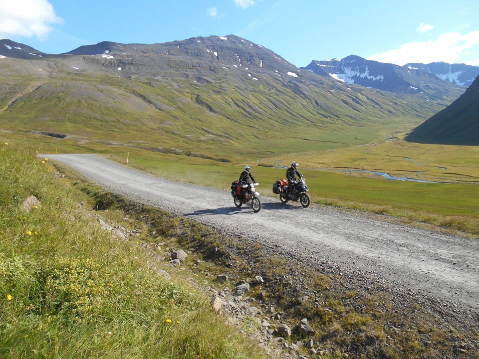 Terre, terre ! Sous un ciel changeant (!) nous effectuons nos premiers tours de roues sur le sol islandais, sitôt débarqués du Norröna, dans le port encaissé de Seyðisfjörður. Mais très vite, le soleil va faire son apparition. Il ne nous quittera pratiquement plus de tout le voyage, puisque nous ne comptabiliserons qu'une seule vraie journée de pluie sur les 14 jours de présence sur l'Île.